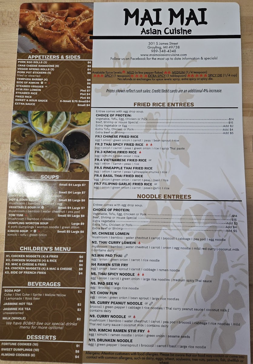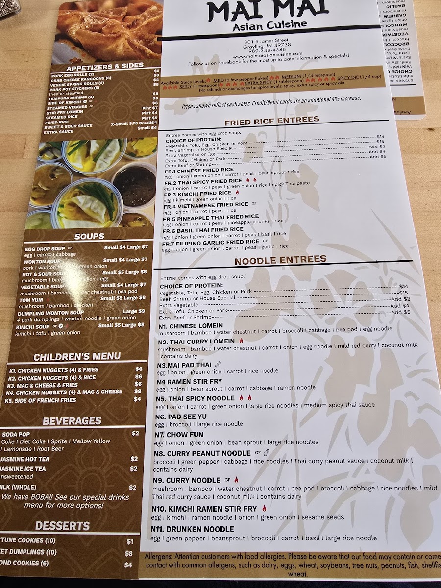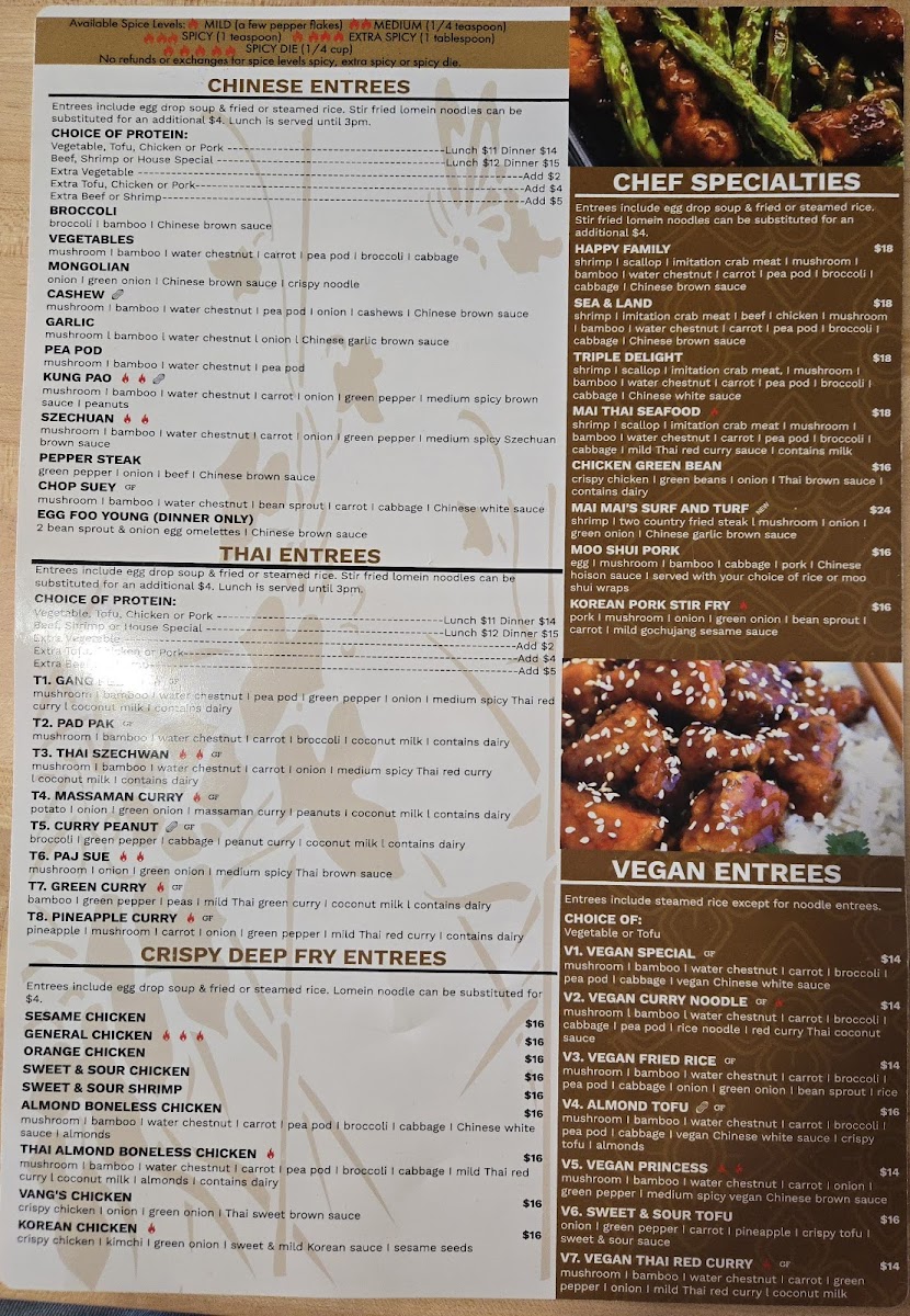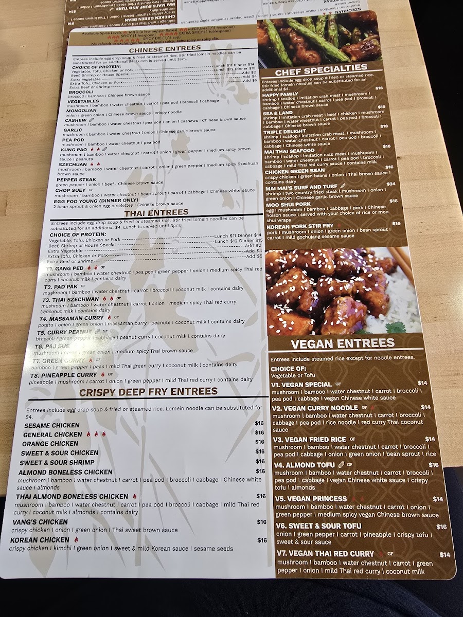 Mai Mai Asian Cuisine offers a thoughtfully curated menu that blends classic Chinese and Thai flavors with approachable, comforting dishes. The menu reflects the casual, inviting atmosphere of the restaurant, perfect for those looking to enjoy a relaxed meal whether it’s a quick lunch break or a comforting dinner.